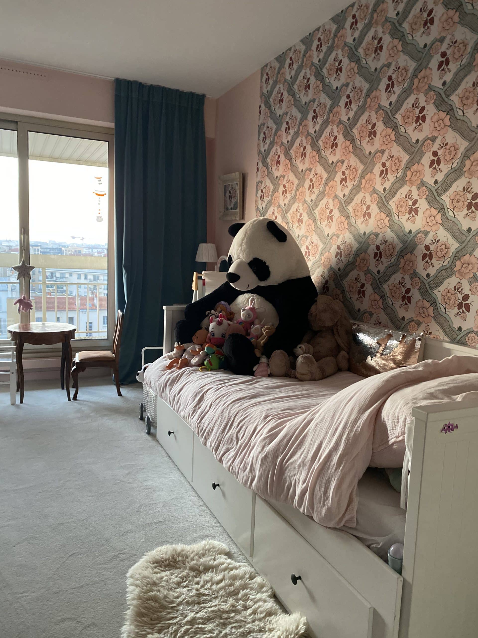 On the night side, color and holiday memories punctuate the rooms. Plants appear in the hallway with a repetitive wallpaper by Antoinette Poisson then in the dressing room with a floral wall hanging. Each room has its own style and a welcoming off-white carpet. Margaux and Victor have imposed a wall hanging in blue fabric on the wall with coordinated curtains and bed frame. The bedrooms being lengthwise, Maison Courty had to play tricks to break this length.