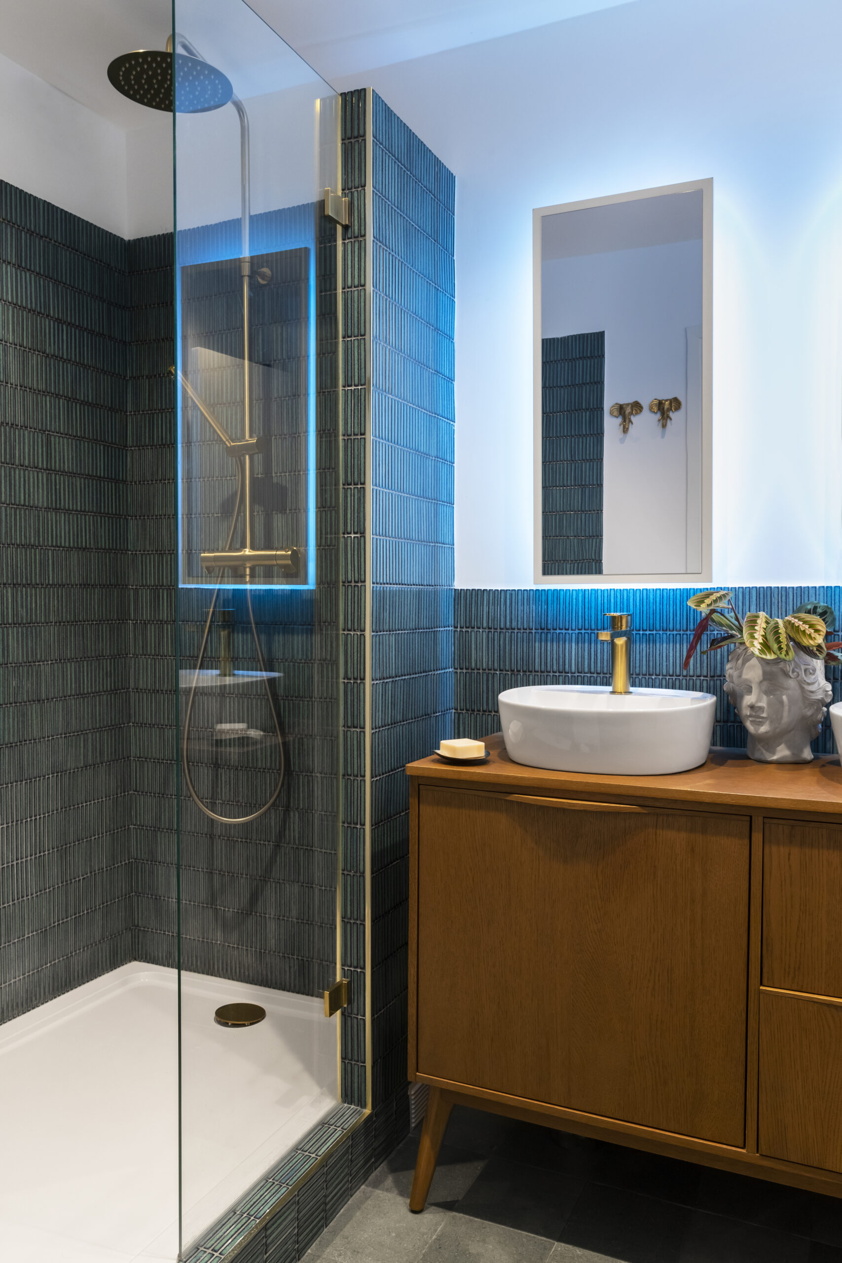 As for the master bathroom with Balinese inspirations, it has green tones with a Shanghai KitKat stick mosaic, underlined by a transparent epoxy joint, Bali stone on the floor Mainzu and wooden furniture Leroy Merlin oak veneer.