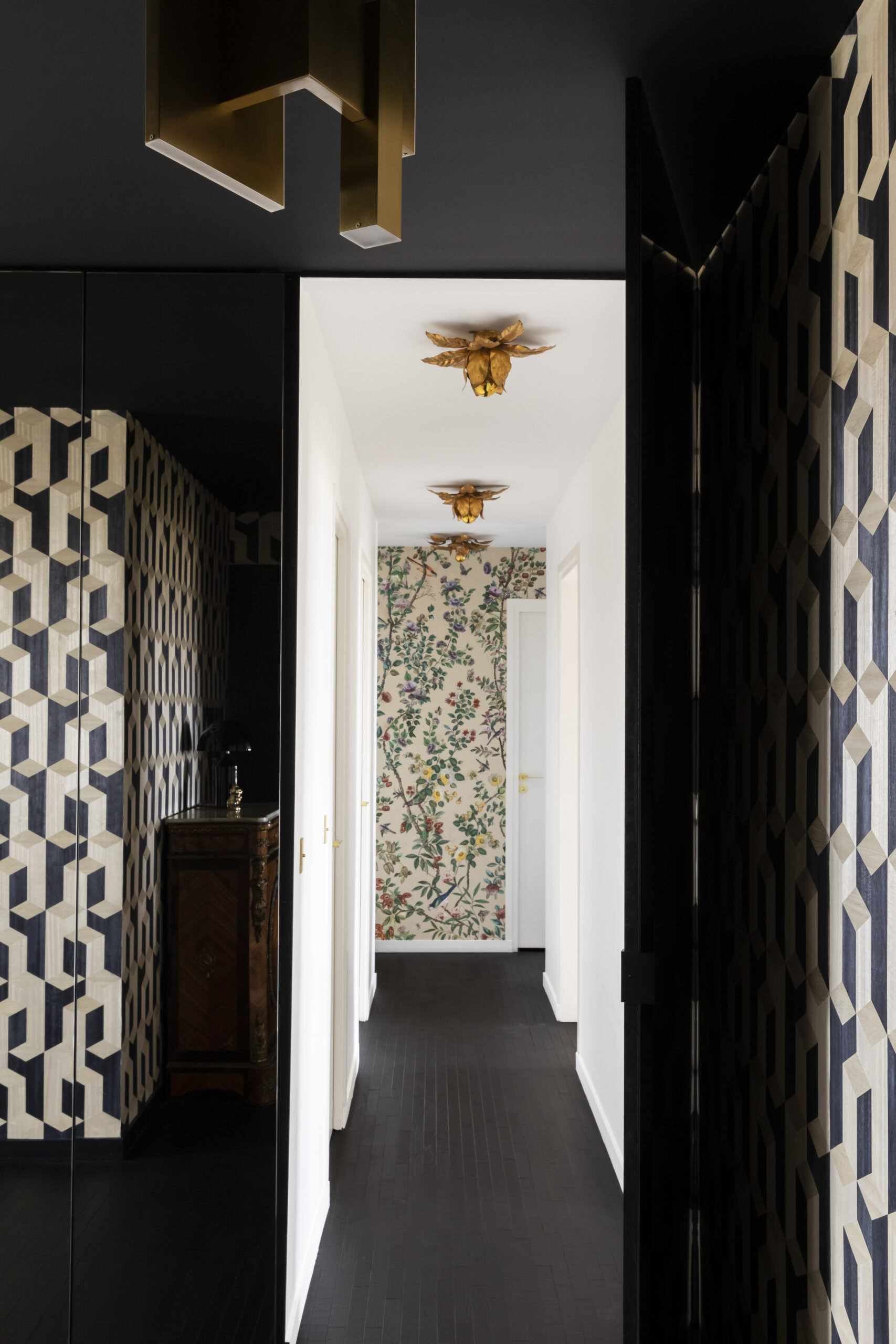 In order to contrast with the aging common areas, the dark entrance was intensified by a marquetry on paper. It comes from a combination of wood and flat surfaces, as well as straight parallelepipeds in contrasting colors, created by Arte. This marquetry of excellence that creates an impressive feeling of depth. In addition, a Napoleon III piece of furniture has regained its function and adds an original style of marquetry. In this entrance, the cupboard doors have been aligned with the access door to the sleeping area to create the illusion and conceal this space.